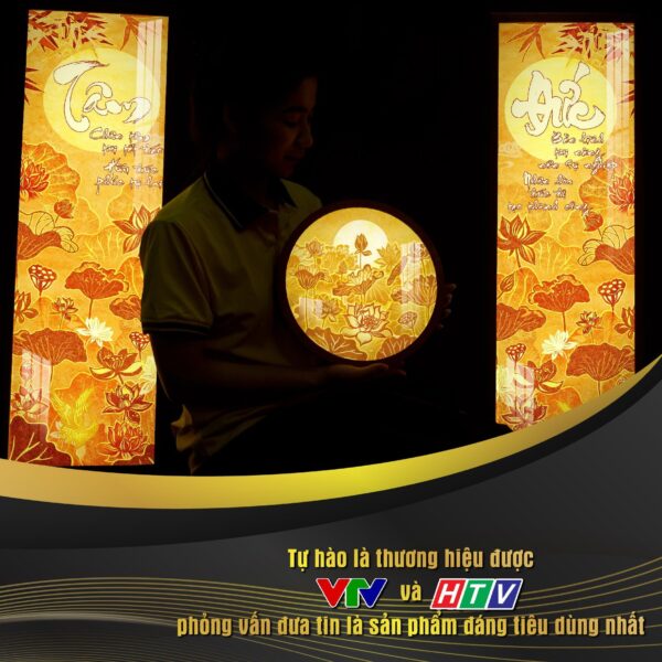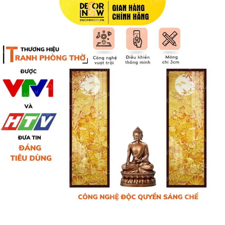 Tranh hoằng pháp đối hoa sen trúc mặt trăng được tích hợp công nghệ Smarthome tiên tiến, mang đến những tiện ích mới mẻ cho người dùng. Với chất liệu MICA Đài Loan cao cấp, làm nổi bật các họa tiết in tinh xảo và độc quyền của tác phẩm. Mực in UV giúp các chi tiết nổi bật và sắc nét hơn hẳn so với những tranh loại 2, loại 3 trên thị trường.