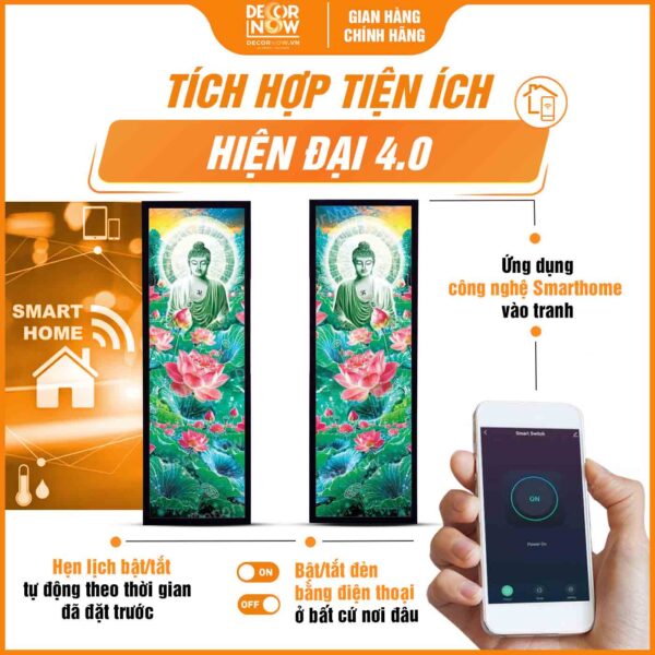 Tranh hoằng pháp đối Phật A Di Đà hoa sen hồng DecorNow HD874 là tác phẩm nghệ thuật nổi bật trong bộ sưu tập “Bảo Liên Tịnh Thủy – Vạn Phật Quang” với hiệu ứng đom đóm độc đáo. Bộ sưu tập lần này tập trung vào khắc họa hình ảnh Đức Phật từ bi, an lạc cùng với vẻ đẹp thanh khiết của hoa sen tinh khôi. Điểm đặc biệt của bức tranh HD874 còn nằm ở ánh sáng nổi kết hợp hiệu ứng đom đóm độc đáo, nhờ vào công nghệ in độc quyền và kỹ thuật ánh sáng đặc biệt, tạo nên bức họa đầy sống động và chân thực đến từng chi tiết. Bức tranh được chế tác từ những họa sĩ tài hoa, am hiểu sâu sắc về Phật Pháp, từng chi tiết khắc họa gửi gắm nhiều ý nghĩa về sự an lành và bình yên.