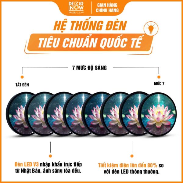 Tranh hoằng pháp sen hồng san trọng HD852 là một phần của bộ sưu tập độc đáo “Bảo Liên Tịnh Thuỷ”, nổi bật với hiệu ứng đom đóm rực sáng khi bật đèn. Sự tương phản độc đáo giữa hai trạng thái sáng tối giúp tôn lên vẻ đẹp tinh tế của tranh mà còn mang đến trải nghiệm thị giác mới lạ và đầy thu hút.