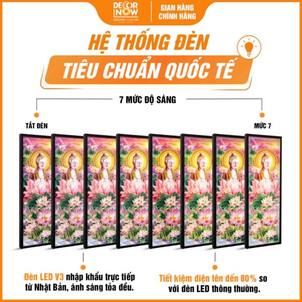 Bộ sưu tập mới “Bảo Liên Tịnh Thủy – Vạn Phật Quang” được chế tác từ chất liệu MICA tráng gương, nhập khẩu từ Đài Loan giúp các họa tiết tranh thêm phần sinh động và nổi bật. Khung PE Composite cao cấp, vân gỗ sang trọng, góp phần tôn thêm vẻ đẹp cho tác phẩm. Ngoài ra, sản phẩm còn được trang bị hệ thống đèn LED V3 với ánh sáng tỏa đều làm nổi bật các hiệu ứng đom đóm giúp tranh trở nên linh thiêng hơn rất nhiều.
